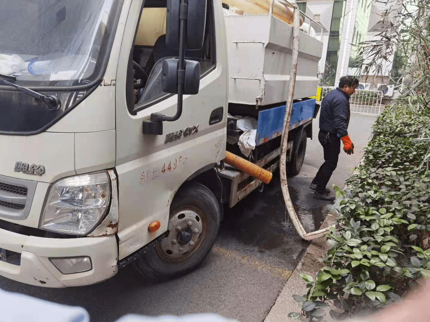 3、利用工具挖去隔油池表面凝固油垢,或啟動吸污車吸出油池內污水到化油結塊物吸完為止;